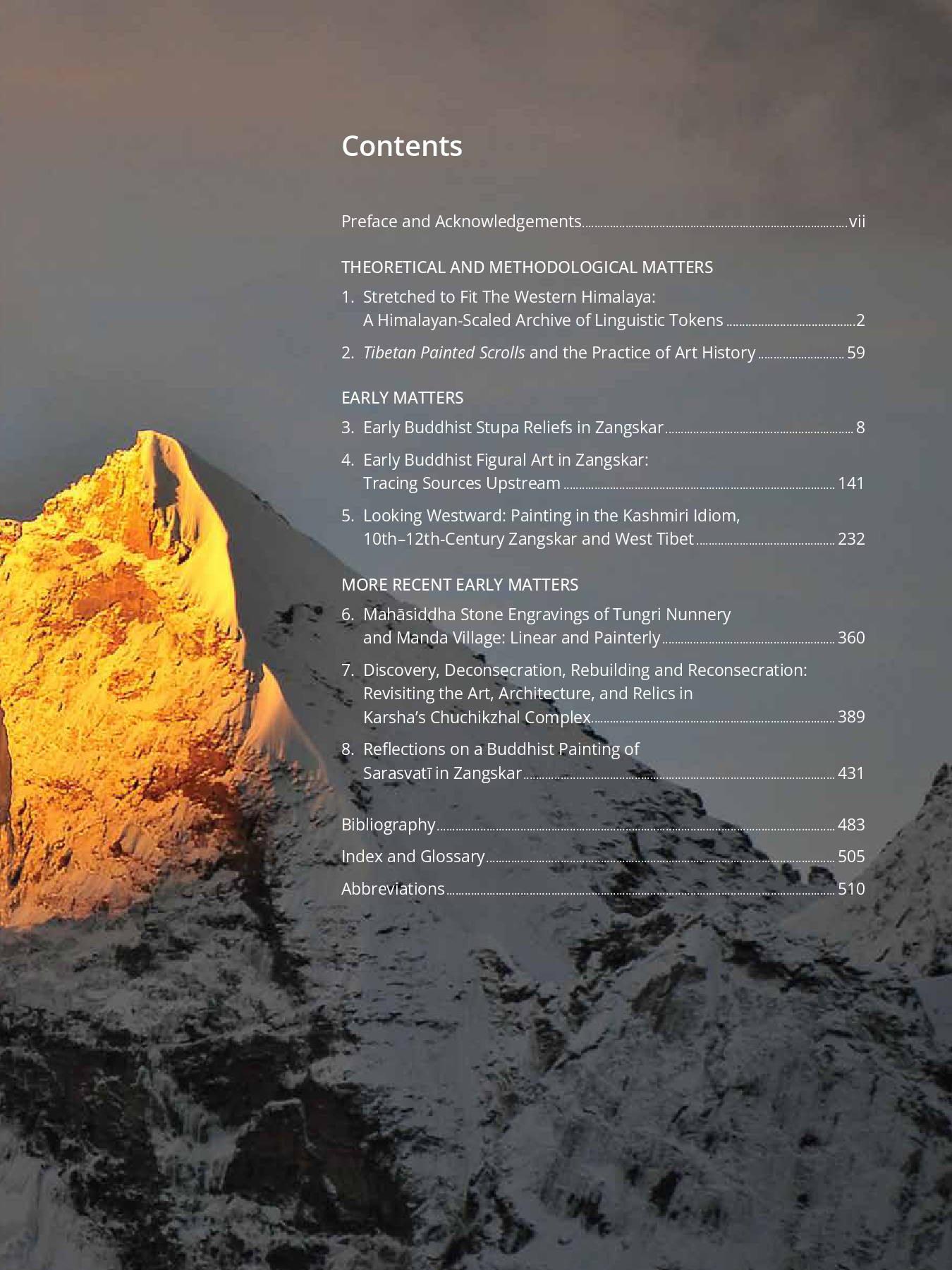 The first chapter of Part I, “Theoretical and Methodological Matters,” takes a historiographic approach to highlight misunderstandings in regional nomenclature. The second chapter reconsiders the relevance of the influential Tibetologist and art collector, Giuseppe Tucci, in the practice of art history on Tibet and the western Himalaya. The three chapters of Part II, “Early Matters,” successively examine the earliest low relief stupa engravings on stone in Zangskar and Ladakh, the early figural carvings and paintings in the area, and the important early Esoteric Buddhist sculptural and painted program at the Malakartse Khar site in Zangskar. The latter are compared to other extant sites in western Tibet. The sixth chapter, the first of three in Part Three, examines two radically different sets of Mahasiddha stone carvings in two neighboring villages of Zangskar. Chapter 7 recounts the discovery, recovery, expansion, and renovation in the twentieth and twenty-first centuries of twelfth- to fifteenth-century structures, paintings, sculptures, and other finds at Karsha village by the Karsha Lonpo Sonam Wangchuk and his family. The final chapter considers a single painting of Sarasvati of late fifteenth- or early sixteenth-century date preserved in the Phugtal Monastery of Zangskar, conjuring the embedded religious and social significance to its monastic sponsor who is depicted at the bottom of the painting. The 585 illustrations, with many details, represents an expansive documentation of culture heritage currently threatened by climate change and the lack of protection for objects traditionally displayed in open view.